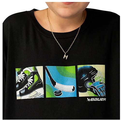 The Bauer Graphic Tee 1 T-Shirt Junior in black brings hockey-inspired style into everyday life for young players. With its hockey-inspired graphic placed at the center of the chest, it creates a sporty look and combines casual design with pleasant comfort.
