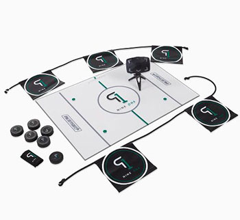 Developed by HockeyShot in collaboration with hockey star Tyler Seguin, the Nine One Shooting Kit gives you everything you need to take your shooting skills to a whole new level and score more goals than ever before, whether you're an up-and-coming player or a seasoned pro. Improve your shot power: The HockeyShot Nine One Shooting Kit allows you to specifically target your shot power. The five included standard pucks enable you to practice your shots repeatedly and continuously increase your power. Precision and technique: The precision of your shot is crucial for success in hockey. The Dryland Speedpuck included in the kit allows you to improve your accuracy, while the Nine One Shooting Pad provides an ideal surface to refine your technique. Speed up your reaction time: Quick reactions are essential in hockey. The Nine One Stickhandling Weight helps improve your hand-eye coordination and reaction time, directly impacting your shooting skills. Challenge yourself with Nine One Extreme Targets: The kit includes five Nine One Extreme Targets, allowing for a variety of target practice. These targets will test your precision and accuracy, helping you perfect your shooting. Train like a pro with the Reactive Sniper: The Reactive Sniper is a highlight of the Nine One Shooting Kit. This innovative training device tests your speed and shooting accuracy by moving and measuring your reactions in real time. It simulates the challenges of a real game and helps you improve your shooting skills under pressure. The Hockeyshot Nine One Shooting Kit includes: 5x Standard Pucks, 1x Dryland Speedpuck, 1x Nine One Shooting Pad 24" x 36" / 60.96cm x 91.44cm, 1x Nine One Stickhandling Weight, 5x Nine One Extreme Targets, 1x Reactive Sniper